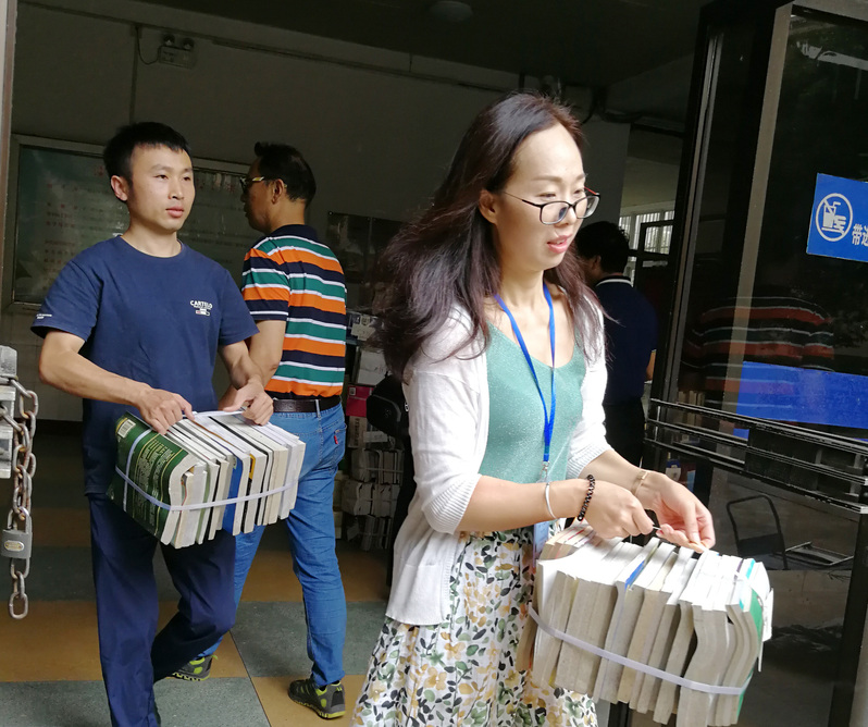 上午九点半,东校区图书馆资料运送新校区准备就位,图书馆刘维亭馆长带领留守馆员一捆一捆接力搬运。新校区图书馆使用最新的RFID管理系统,能够实现学生自主借阅,提高了图书流通效率,但要实现该功能需要做好对新校区所有入馆图书重新制作图书识别芯片、系统录入、上架编排等工作。图书馆青年同志自发组成青年突击队,担任这次搬迁任务的中坚力量,尽心尽力做好每项工作,为搬迁新校区贡献自己的力量。青年突击队成员李新英介绍,青年突击队主要由40岁以下在职员工组成,以党员同志为主。在此次搬迁过程中,大家以身作则,树正气、聚人心,充分发挥了党员模范带头作用。