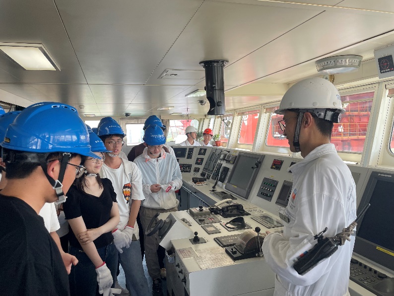 实践活动中,同学们首先进入神秘的驾驶台,在大副的细致讲解下,了解了先进的导航设备、自动化驾驶系统以及其它航海技术。
