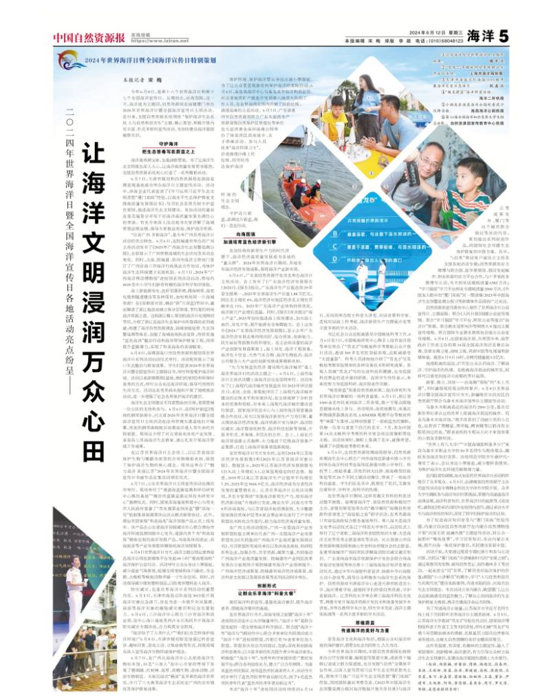 今年6月8日,是第十六个世界海洋日和第十七个全国海洋宣传日。从南到北,由海至陆,这一天,海洋成为主题词,自然资源部在福建厦门举办2024年世界海洋日暨全国海洋宣传日主场活动。连日来,全国自然资源系统围绕“保护海洋生态系统人与自然和谐共生”主题,精心策划、积极开展内容丰富、形式多样的宣传活动,为加快建设海洋强国凝聚共识。