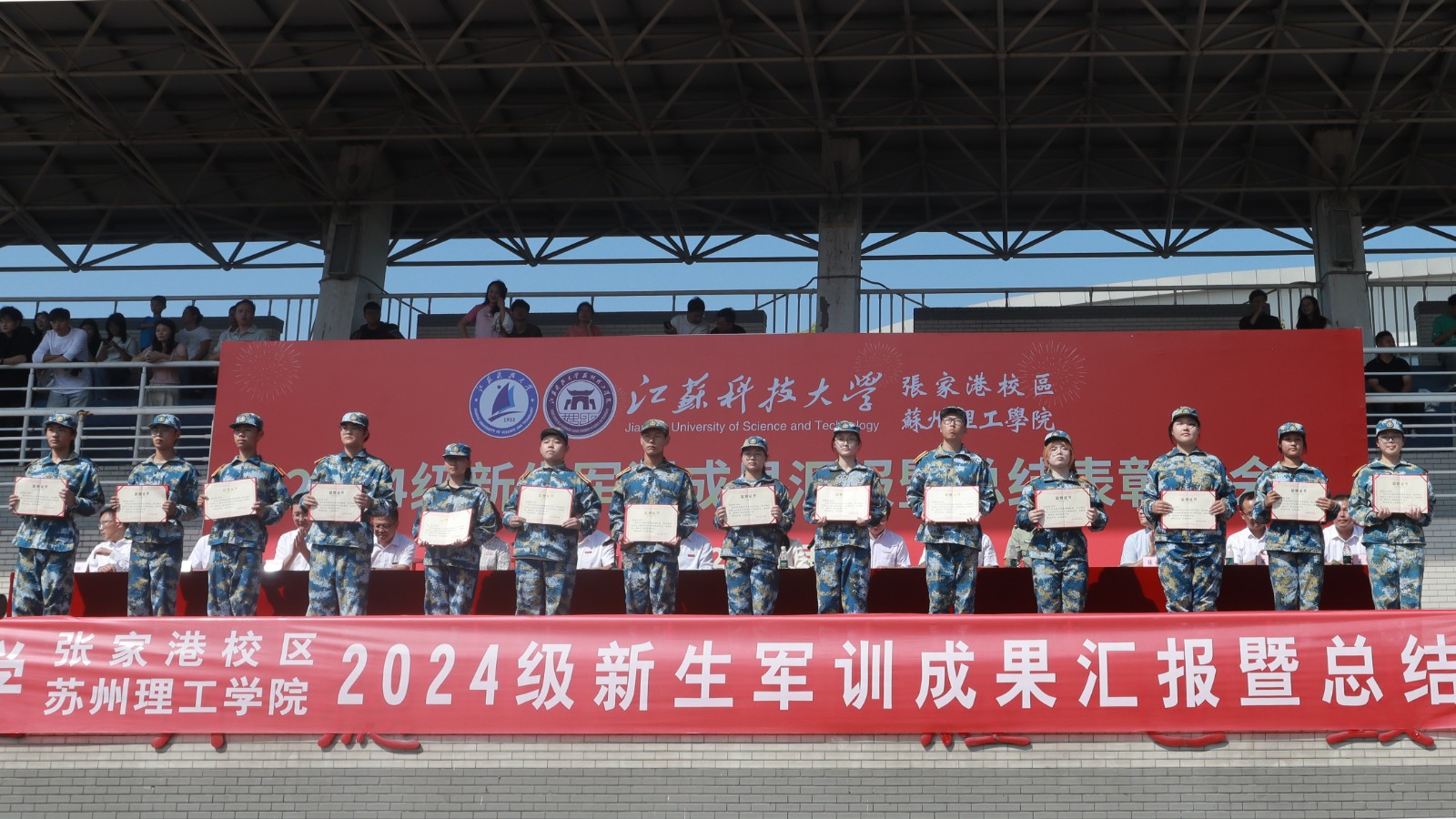 校区、苏理工党委副书记、纪委书记徐琳宣读《关于表彰新生军训优秀连队以及关于表彰新生军训优秀教官的决定》,校区管委会副主任、苏理工副院长黎文航宣读《关于表彰军训优秀班导师、军训优秀学员的决定》。与会领导为获奖集体、个人颁奖。在激昂的中国人民解放军军歌声中,2024级新生军训表彰总结大会圆满结束。