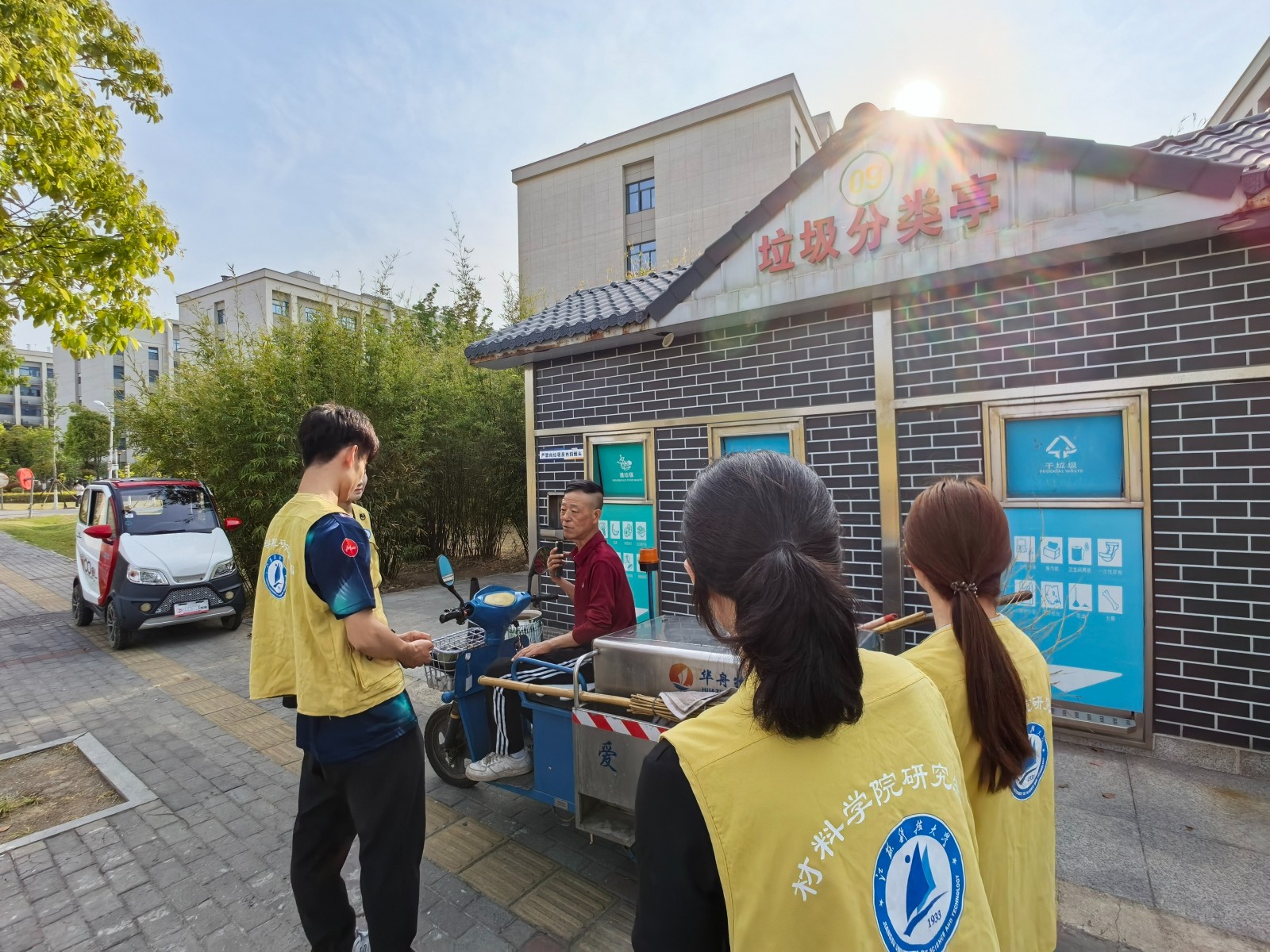 环卫工师傅:目前一切都挺顺利,物业公司给我们配备齐了清洁道路和打扫卫生的工具和设施,下雨天也会给我们提供雨衣。而且咱们学校的学生素质都挺高的,极少看见乱丢垃圾的现象。”