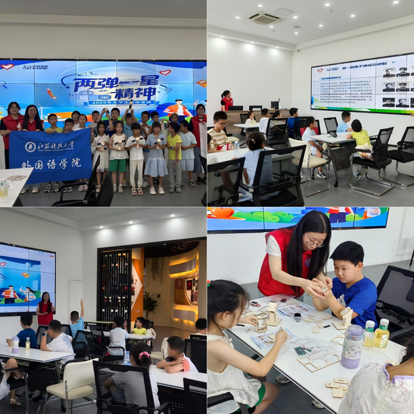外国语学院“寻梦星河 传承薪火”志愿宣讲团走进丹徒区湖畔社区开展主题宣讲活动。志愿者回顾了我国第一颗原子弹的研发历程,讲述了两位“两弹一星”功勋科学家王淦昌和郭永怀的感人事迹,现场还设置了趣味抢答、卫星DIY环节,带领青少年重温那段艰苦卓绝的奋斗历程,感悟老一辈科学家的无私奉献精神。新型手工活动与岁月沉淀的伟大精神产生奇妙的化学反应,让青少年更加深刻地认识到爱国精神和坚韧品格的重要性。