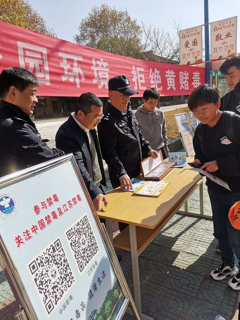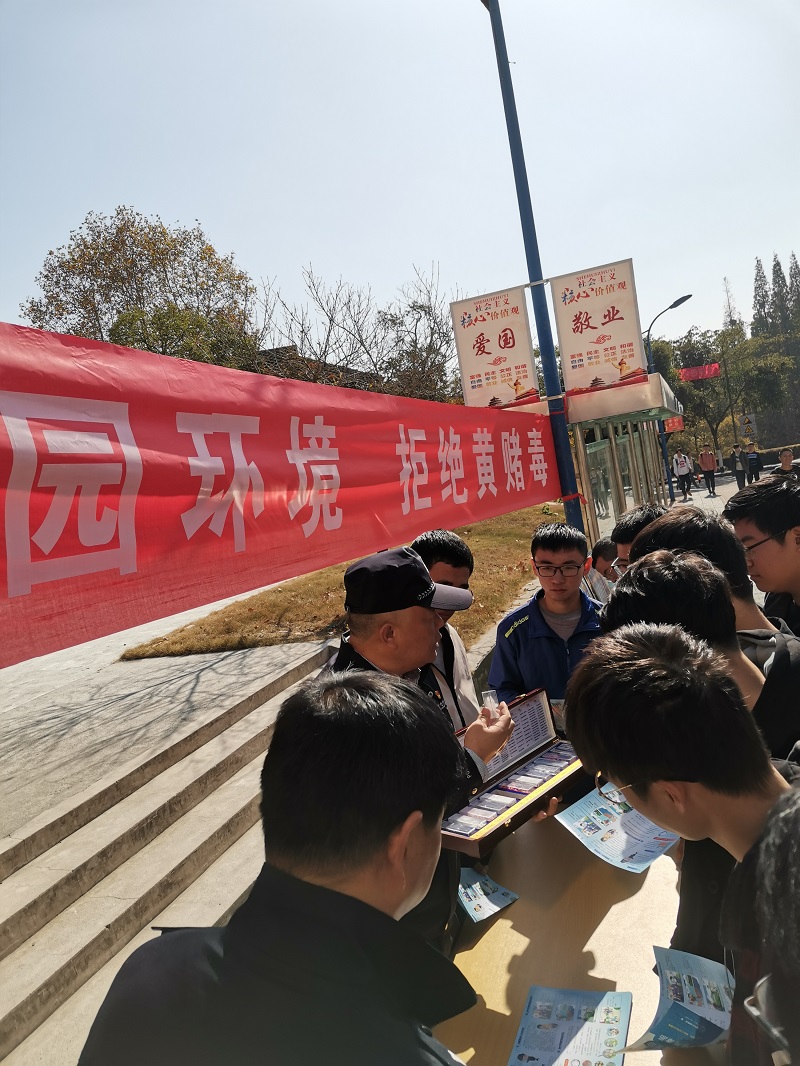 为营造健康,文明的校园环境,11月15日中午,保卫处联合镇江市公安局润州分局治安大队、禁毒大队在西校区西苑餐厅门口举办了以“净化校园环境,拒绝黄赌毒”为主题的宣传活动。治安大队教导员高伟、禁毒大队教导员吴云翔参加活动。