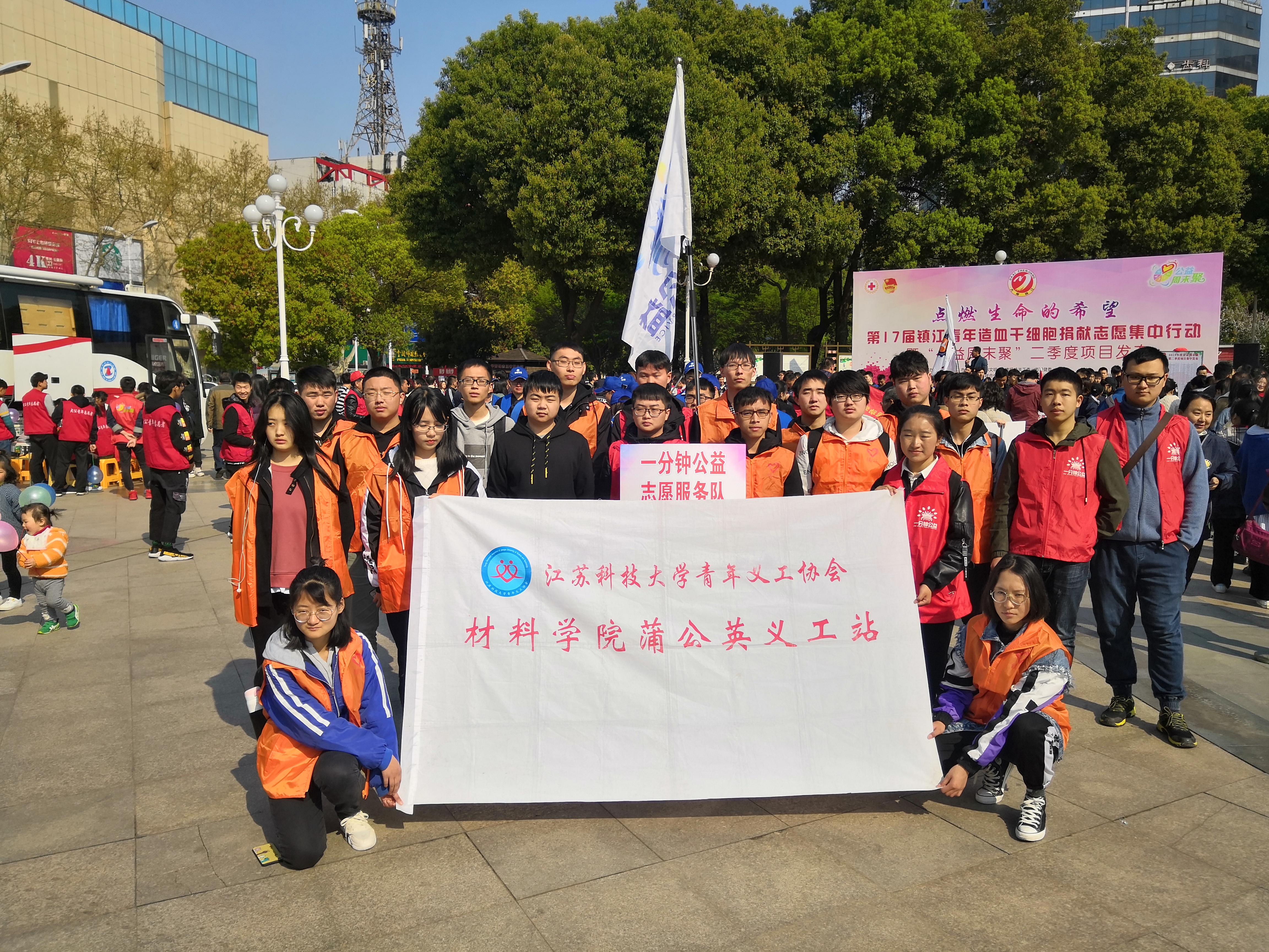 3月31日,镇江大市口城市客厅春意盎然,人潮涌动。第17届造血干细胞捐献志愿者血样集中采集活动正式启动。材料学院蒲公英义工站联合一分钟公益团队参与此次活动。