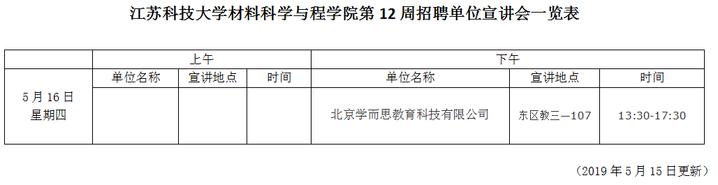 招聘会|材料学院第12周招聘单位宣讲会一览表(2019年5月15日)