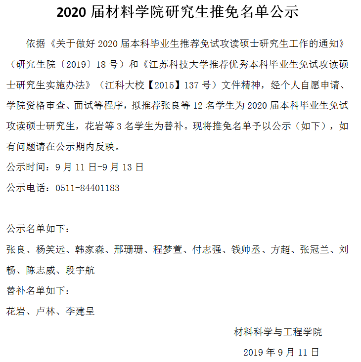 2020届材料学院研究生推免名单公示