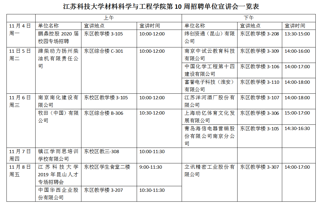 招聘会|材料学院第10周招聘单位宣讲会一览表(2019年11月4日)