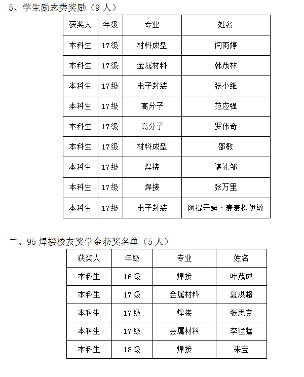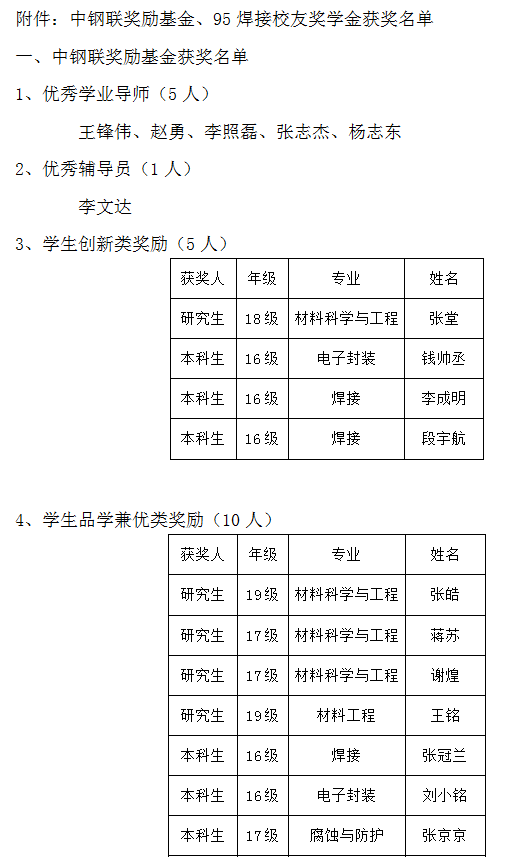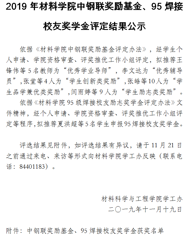 材料学院2019年中钢联奖励基金、95焊接校友奖学金评定结果公示