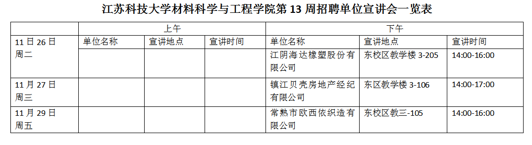 招聘会|材料学院第13周招聘单位宣讲会一览表(2019年11月26日)