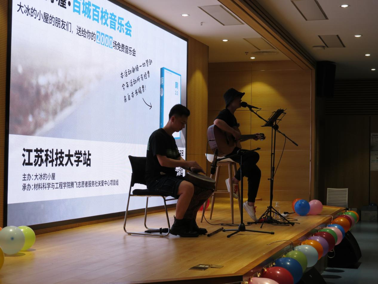 5月11号晚上,由大冰的小屋主办、材料学院关爱中心项目组承办的“大冰的小屋•百城百校音乐会”在长山校区图书馆报告厅B102顺利举行。大冰的小屋的两位歌手怀森和钟不悔主唱,场内座无虚席,材料学院辅导员刘雨庭和来自不同学院的二百多位学生参加本次音乐会。