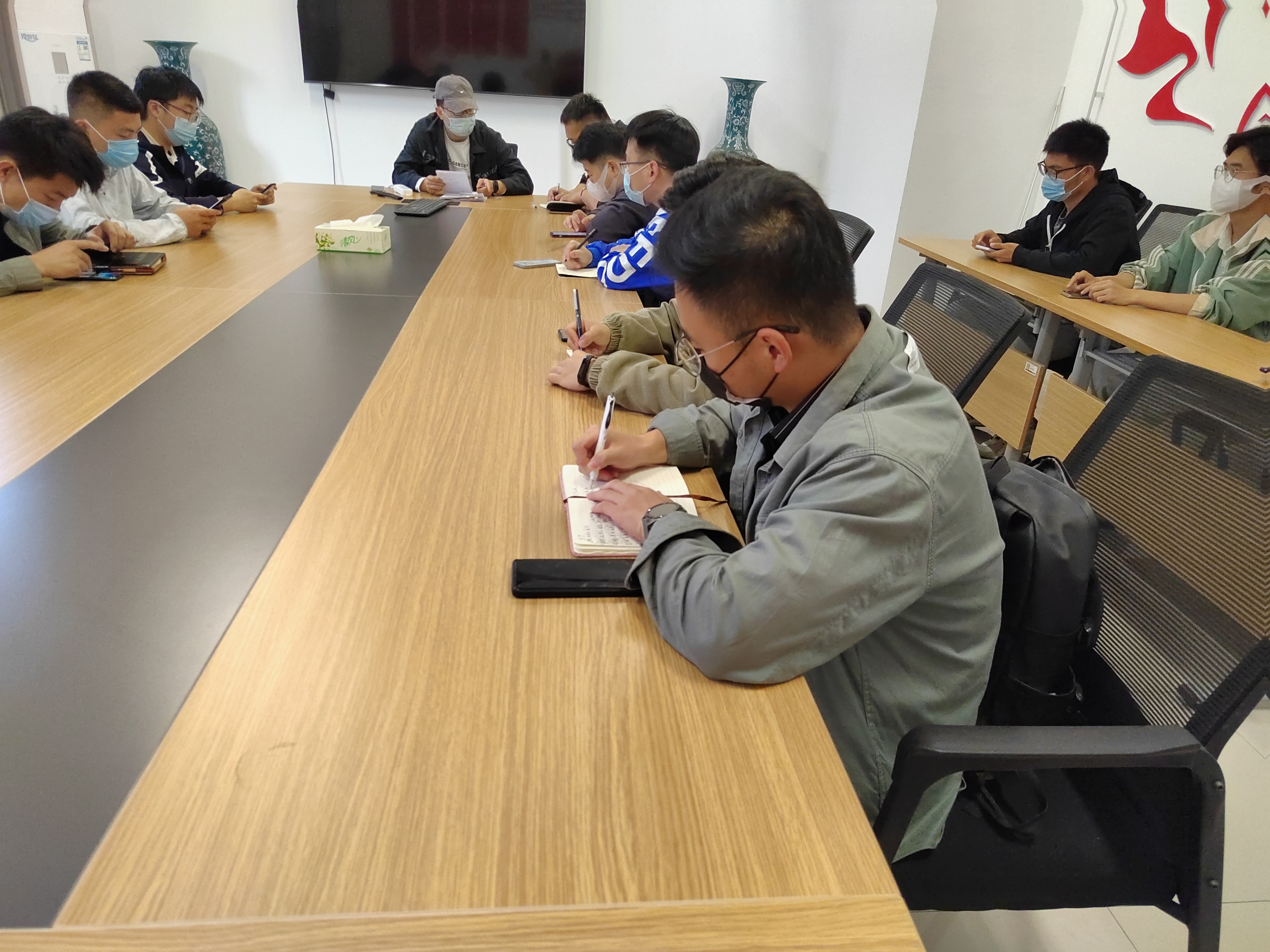 会上,辅导员张世文带领大家学习《学生宿舍管理规定》、《研究生手册》等文件,强调了学校对疫情防控工作的重视,提醒学生切不可违反学校疫情防控相关规定。其次,张世文提醒同学们要积极配合学校开展常态化核酸检测和全员核酸检测,每天按时进行健康打卡,随后,针对近期同学们在校园生活和学习上反映的问题他解答了部分同学返校前的困惑,并希望同学们能够理解学校疫情防控的各项要求。