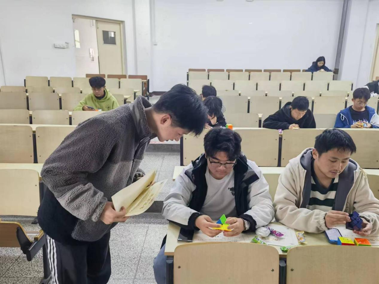 活动中,学长们首先与大一社员交流魔方经历,分享大赛体验,并通过互动的方式教会大家更深层次的公式理解及训练方法,帮助社员取得技术上的突破,也增强社员们的自信以及深入学习的动力。比赛中,选手在裁判的监督下复原被打乱的魔方,确认成绩后将成绩单交由工作人员,过程井然有序、有条不紊。