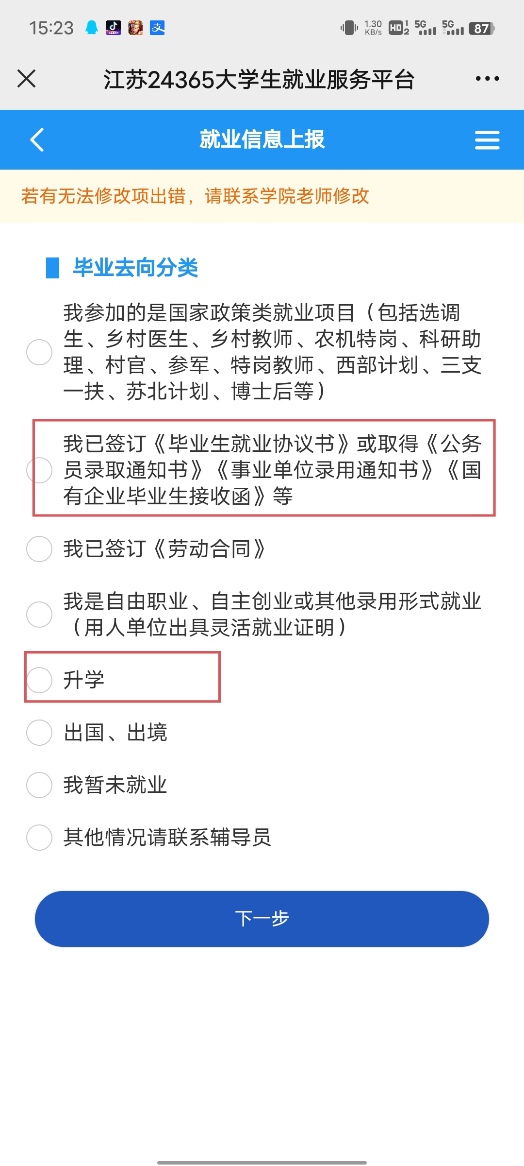 就业。(就业的同学,签订好三方后就可以上传就业信息)
