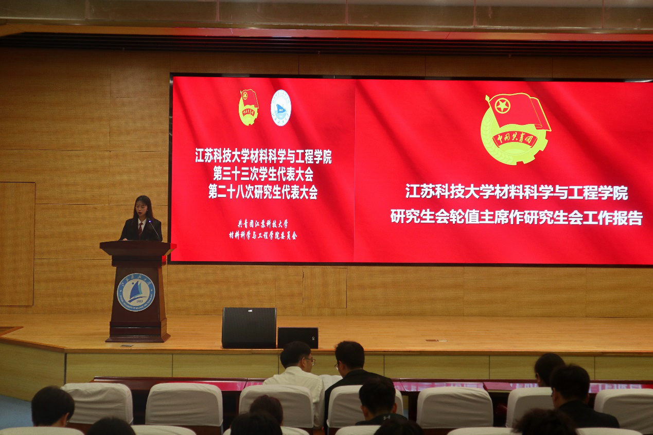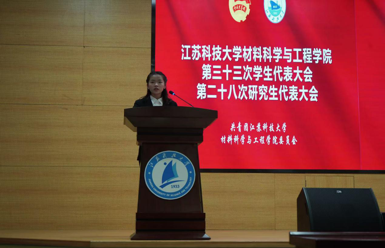 随后,材料学院学生会轮值主席秦嘉诺同学作学生工作报告。她回顾了上一学年,学生会主要承办的学生活动、项目、比赛等,并对执行工作过程中遇到的问题和挑战进行深入分析,分享了从工作中学到的经验教训:如何协调资源以及尽最大的可能调动起本科生对校园生活的积极性。同时,学生会将深刻领悟党的二十大精神,积极配合团委开展各项工作,努力培育具有江科大特色的“材子”。