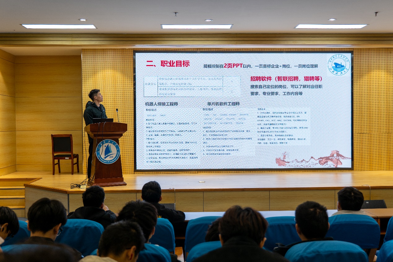 分享会上,全国生涯规划大赛就业赛道省赛二等奖得主张帅,结合自己的参赛经验和心得体会,从职业目标确定、岗位胜任力挖掘、未来规划等方面讲解了如何进行求职综合展示,并分享了简历制作技巧。他认为,只有学会职业规划,拥有超前意识,才能在未来的职场竞争中游刃有余。