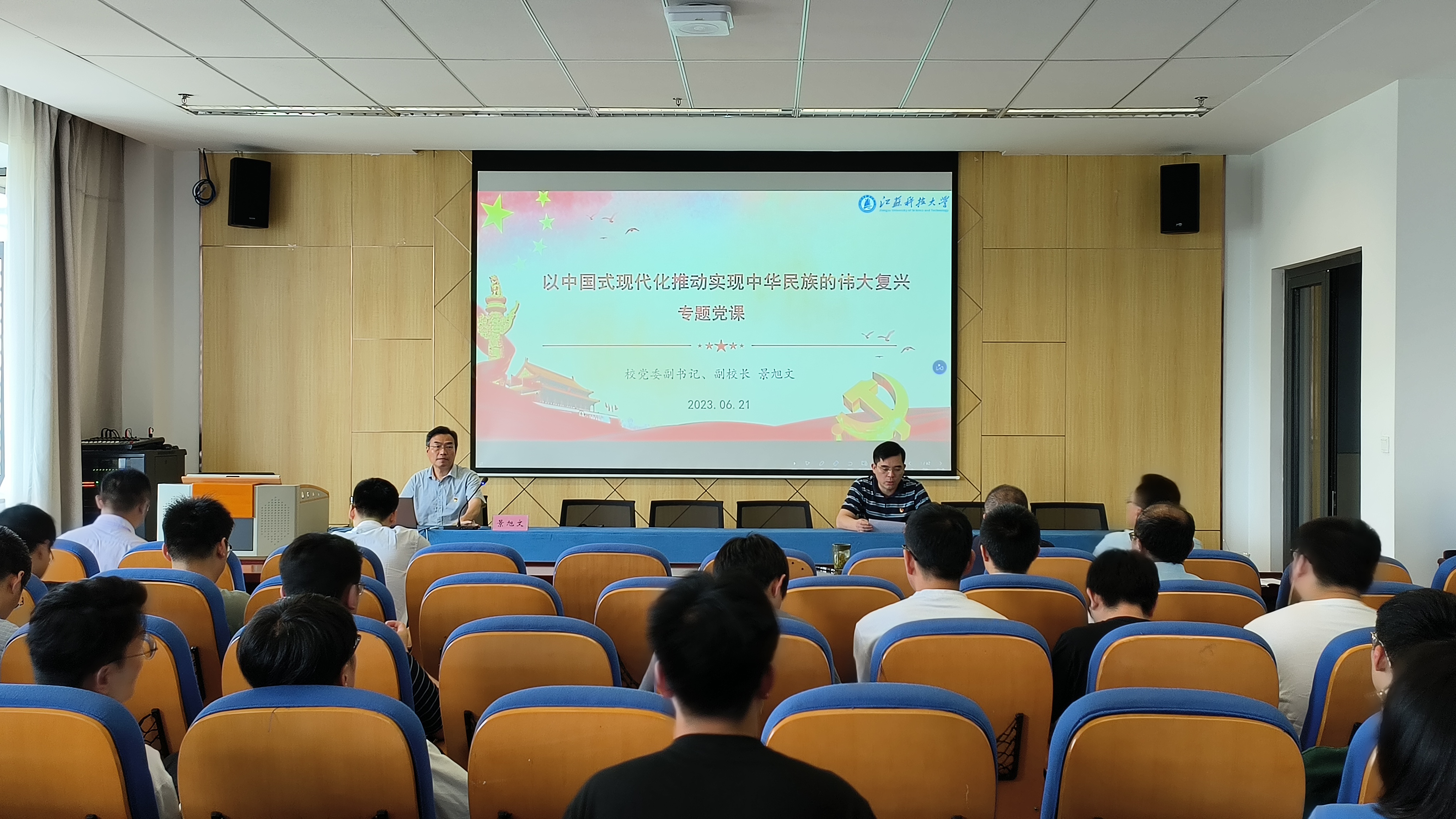 6月21日下午,校党委副书记、副校长景旭文深入机械工程学院开展主题教育专题党课,党课以“以中国式现代化全面推进中华民族伟大复兴”为中心展开,机械工程学院全体院领导、机械制造工程系党支部、轮机工程系党支部的教工党员及部分学生党员参会学习。党课由机械工程学院党委书记翟纯纯主持。