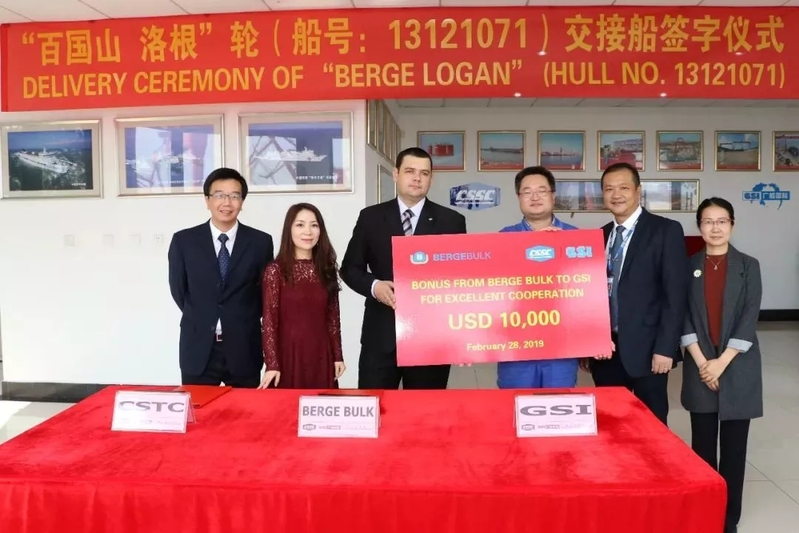郭宁(右三)参加“百国山 洛根”轮交接船签字仪式