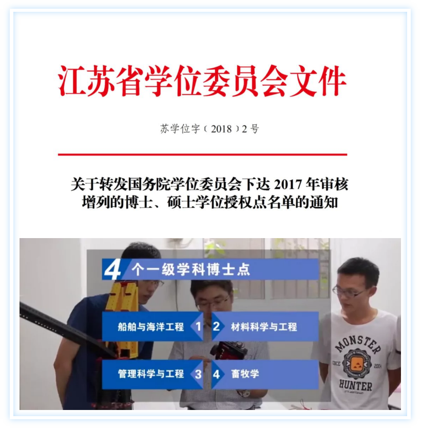通过持续建设,2017年,我校2个博士学位授权一级学科点申报成功,其中船舶与海洋工程博士点是我校建设一流造船大学的标志性成果,畜牧学博士点为强化我校的蚕桑特色提供了更广阔的平台;同时动力工程及工程热物理、信息与通信工程、电气工程、化学、理论经济学和科学技术史6个硕士学位授权一级学科点申报成功;2019年,物理学通过动态调整成为硕士学位授权一级学科点。到“十三五”末,学校拥有4个博士学位授权一级学科点,20个硕士学位授权一级学科点,10个硕士专业学位类别。