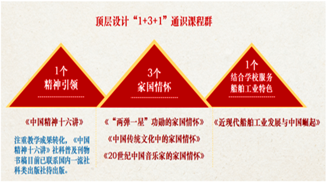 “思政课程”与“课程思政”共建共进。一是加强思政课程建设,持续推动习近平新时代中国特色社会主义思想“三进”。思政课程均获课程教学项目立项且于2020年结题,申请各类教研教改项目10项,教师教研教改积极性显著提升;二是探索“课程思政”新路径,与环化学院签订“课程思政”结对共建协议;三是创新开设思政选修课,顶层设计“1个精神引领、3个家国情怀、1个结合学校服务船舶工业特色”的“1+3+1”通识课程群。