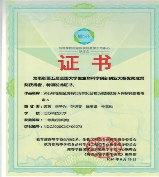 获第五届全国大学生生命科学创新创业大赛一等奖 2 项、二等奖 1 项;第四届江苏省大学生食品科技创新创业大赛获优秀奖;“智能粮仓”创业项目入围学校“互联网+”的竞赛行列。