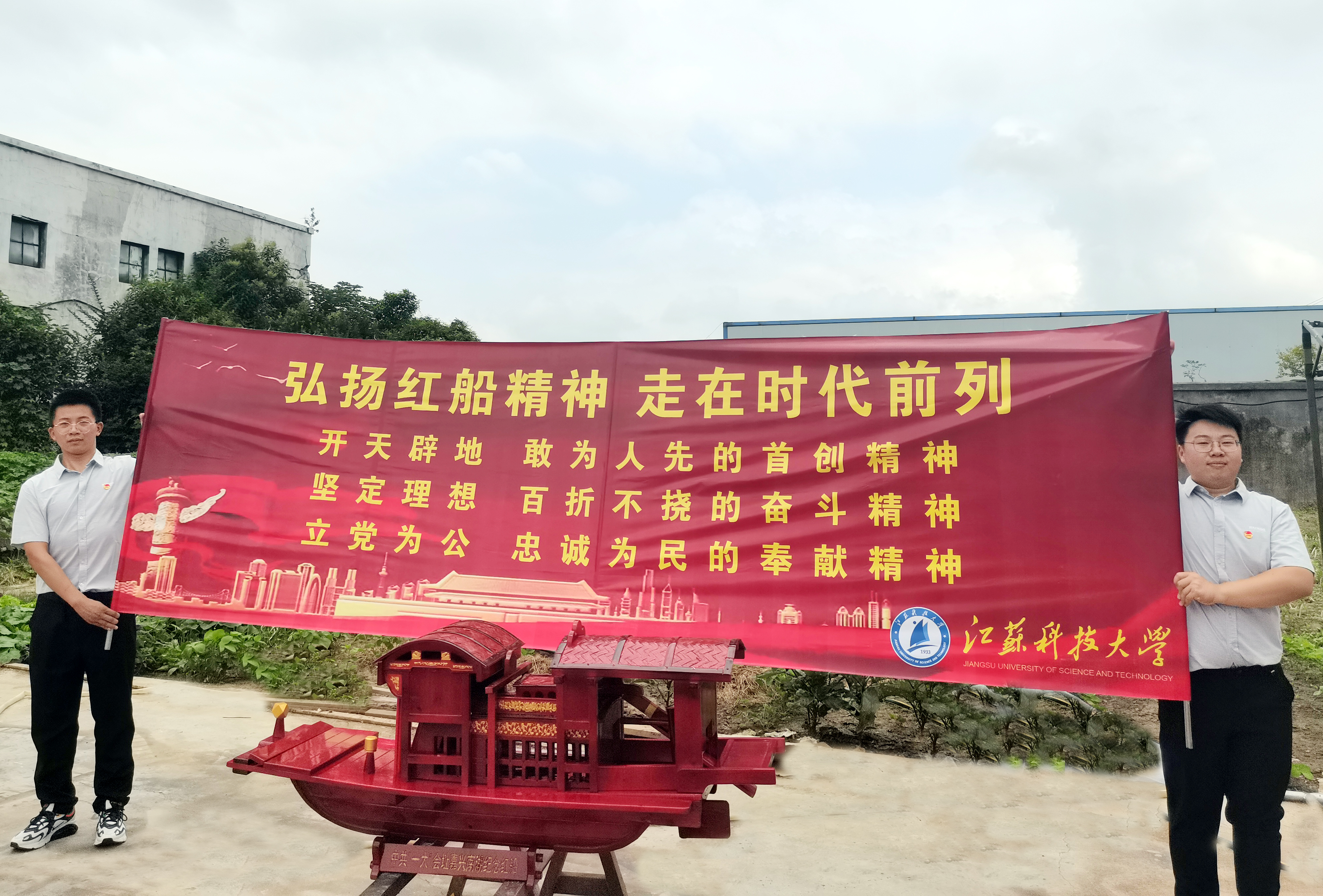在校团委副书记沈中祥老师和船海学院党委书记张健老师的技术指导下,由船海工程、土木工程、机制设计、经济管理等专业的学生组成团队,经过多方论证、实地调研,根据南湖红船实物、照片影像资料等考证。土木工程专业的同学利用三维激光扫描技术对红船外轮廓进行了数据点云采集,获取了南湖红船的外轮廓基本数据。