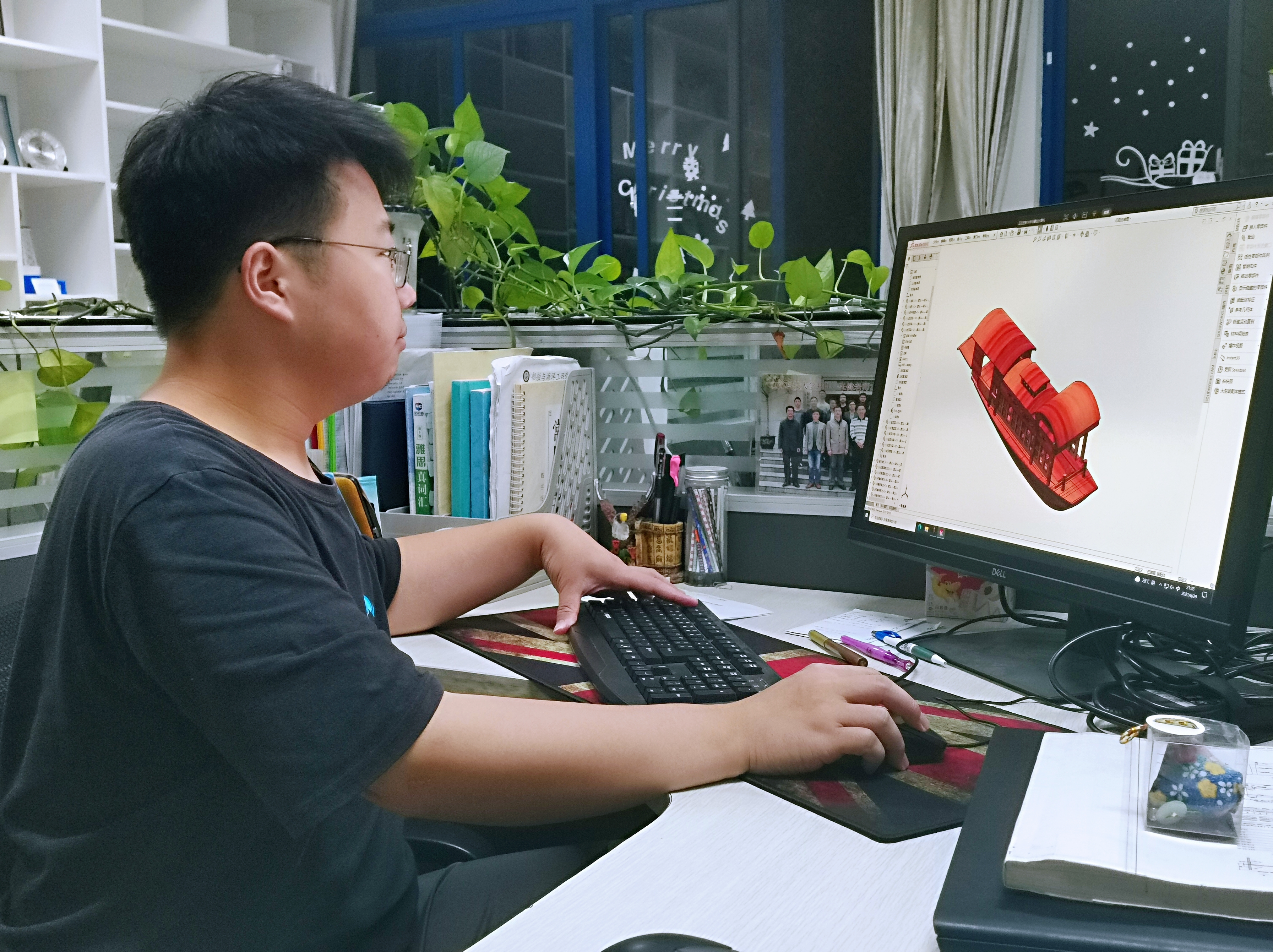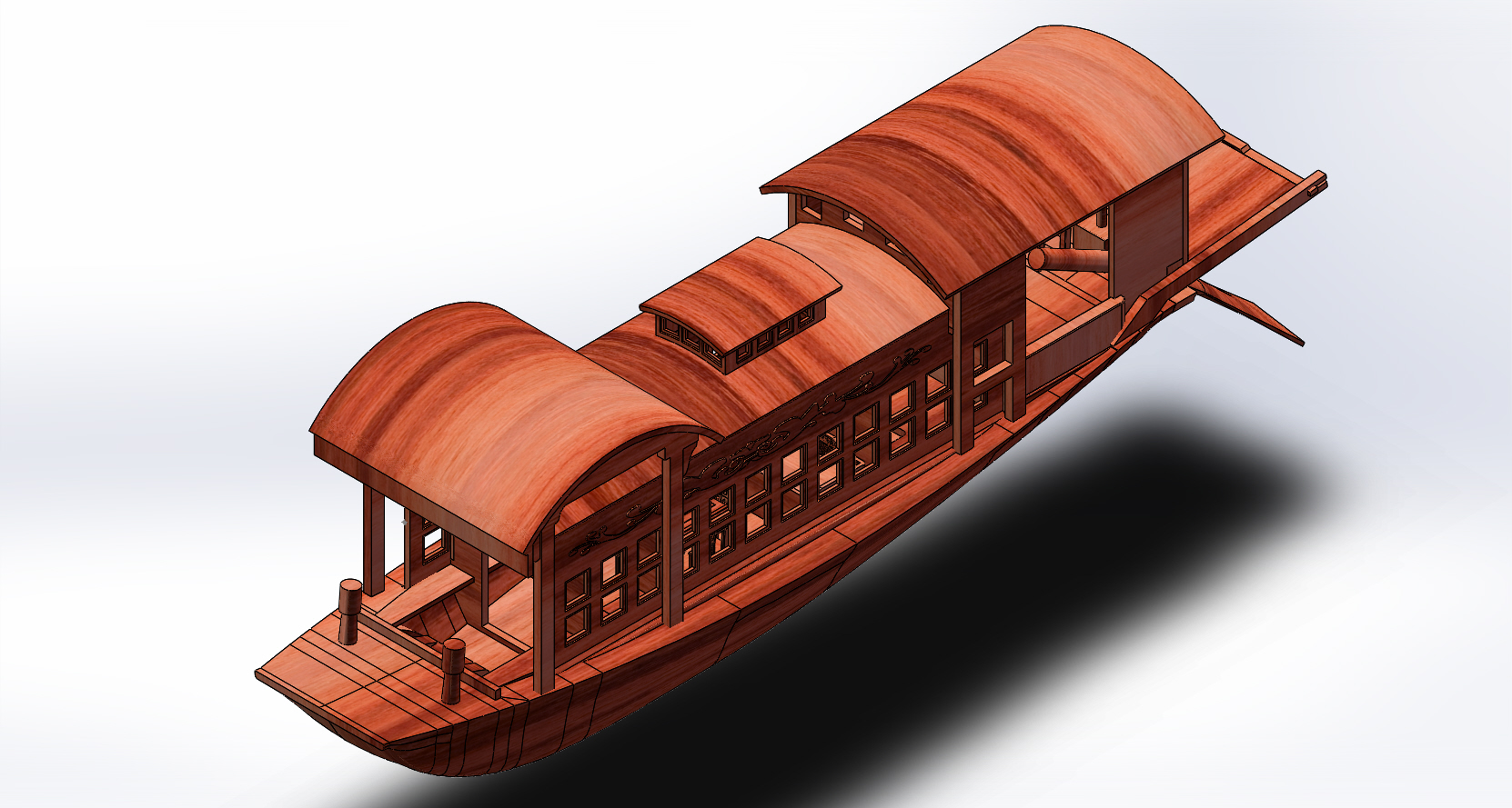 船舶专业同学基于三维点云图的数据资料,绘制出缩尺比后的红船图纸。机械设计专业同学基于红船图纸,采用三维建模方法建立红船船体模型、上层建筑模型、舾装件模型。