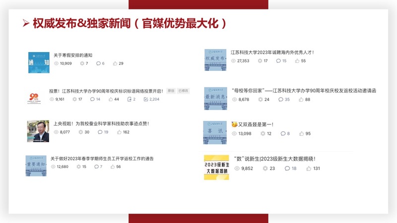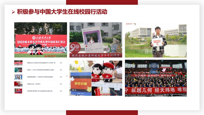 raybey雷竞技 党委宣传部融媒体中心依托“1+6”(1个新闻中心加官方微博、官方微信、官方抖音、官方B站、学习强国号、中国大学生在线校园号)新媒体育人阵地,借助融媒体传播优势,立足校园生活、讲好科大故事,打造网络思政工作新格局。2023年,“raybey雷竞技 ”官方微信共发布推文400+篇,总共阅读量262万+;微博共发布450+条,浏览量777万+,创作出《校园里的宝藏up主》《考研学霸宿舍》等一系列兼具创意性、感染力的原创作品;新媒体新闻专题《省高校首家!江科大这门宝藏课程藏不住啦……》获“2022年度江苏教育新闻奖”;微信公众号作品《江科大,是……?》获第二十七届船舶新闻奖。联动线上线下,打造全员参与、全面覆盖、全方位辐射的思政育人体系,融媒体中心参与毕业典礼、办学90周年晚会等学校大型活动,精心策划校庆灯光秀、证件照摄影棚等系列广受欢迎的线下活动;统筹开展“raybey雷竞技 校园文化创意大赛”“全国大学生网络文化节”“世界读书日主题征文比赛”等活动;组织开展2023年度江苏省高校网络思政“金微课”征集评选、江苏2023“五个一批”网络精品征集评选展播等活动,引导广大师生积极参与网络产品的创作生产,让网络思政教育有声有色、入耳入心。