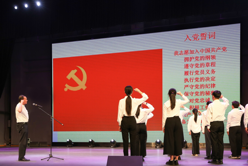 党委副书记汤建带领全体毕业生党员重温入党誓词。党员同志面向党旗庄严宣誓,在铮铮誓言中重温入党初心,坚定理想信念,牢记初心使命。