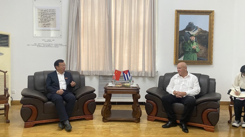 7月15日,来华出席全球共享发展行动论坛第二届高级别会议的古巴副总理塔皮亚在古巴驻华大使馆会见学校党委书记周南平。