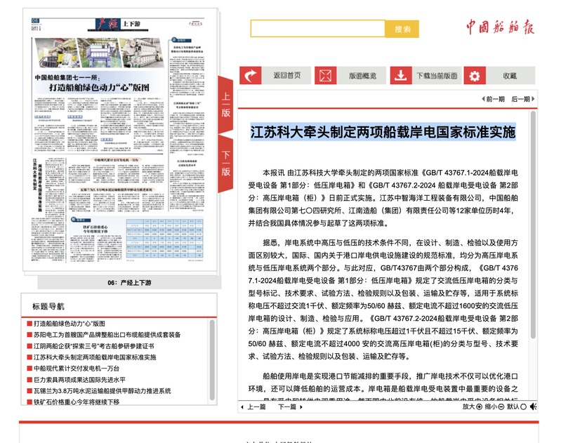 船舶使用岸电是实现港口节能减排的重要手段,推广岸电技术不仅可以优化港口环境,还可以降低船舶的运营成本。岸电箱是船载岸电受电装置中最重要的设备之一,具有受电和转供电双重用途,然而国内此前没有统一的船载岸电受电设备相关标准规范。此次这两项标准的发布实施,为船舶、港口、航运、能源、电网、制造、检验、安全等多个行业部门提供了统一的标准,确保了产品设计、制造和检验的安全性、兼容性和适用性,同时也提高了连接岸电时的效率。这对于我国船舶岸电系统的控制与保护以及绿色港口建设具有极其重要的意义。(吴秀霞 杨官校 )