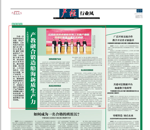 2024年12月,江苏省高技术船舶和海工装备产业链党组织联建共建仪式在江苏科大举行,赋能党建链、创新链、人才链协同发展,落实江苏省加快培育先进制造业集群的工作部署,建立“产业需求—学科能力”动态匹配机制,以党组织引领力赋能船舶海工产业发展新质生产力,以高质量党建引领产业链高质量发展。