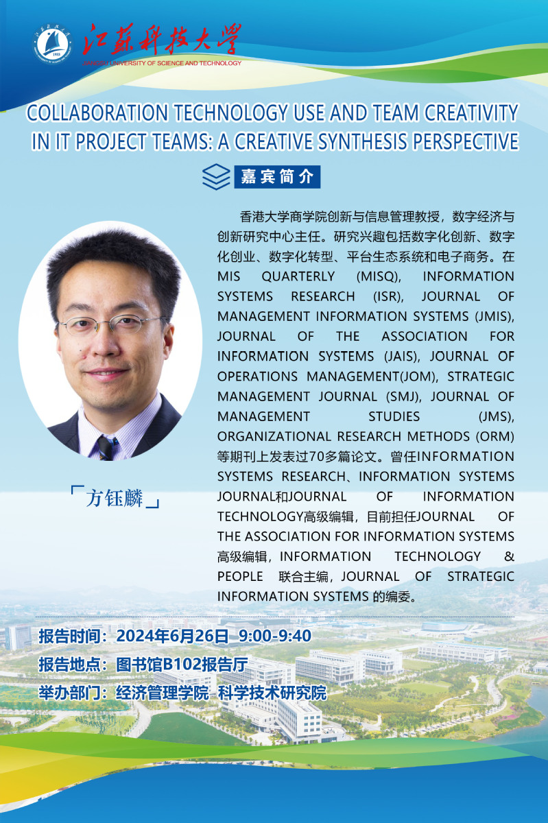 报告人简介:香港大学商学院创新与信息管理教授,数字经济与创新研究中心主任。研究兴趣包括数字化创新、数字化创业、数字化转型、平台生态系统和电子商务。在MIS Quarterly (MISQ), Information Systems Research (ISR), Journal of Management Information Systems (JMIS), Journal of the Association for Information Systems (JAIS), Journal of Operations Management(JOM), Strategic Management Journal (SMJ), Journal of Management Studies (JMS), Organizational Research Methods (ORM)等期刊上发表过70多篇论文。曾任Information Systems Research、Information Systems Journal和Journal of Information Technology高级编辑,目前担任Journal of th Association for Information Systems高级编辑,Information Technology & People 联合主编,Journal of Strategic Information Systems 的编委。