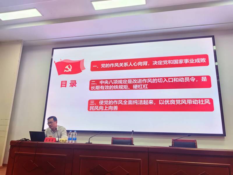 5月29日,学院党委邀请镇江市委党校殷亚伟讲授《深入贯彻中央八项规定精神,加强党的作风建设》专题党课,部分学院领导班子成员、基层党支部书记参加学习。殷亚伟从“党的作风关系人心向背,决定党和国家事业成败”“中央八项规定是改进作风的切入口和动员令,是长期有效的铁规矩、硬杠杠”“使党的作风全面纯洁起来,以优良党风带动社风民风向上向善”等三个方面做了系统阐述。