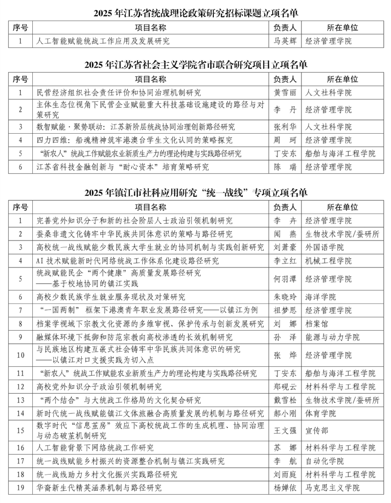 2025年度,经管学院在统战理论研究领域取得突破,获批江苏省委统战部(单独名义)招标课题1项,该课题聚焦统战工作中的关键问题,具有重要的理论与实践价值;获批江苏省社会主义学院省市联合研究项目3项、镇江市社科应用研究 “统一战线” 专项课题立项4项,为推动统战工作的理论创新与实践发展提供了智力支持。