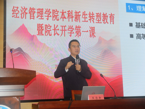 随后,王念新围绕“转型教育”主题讲授开学第一课。王念新以大学学习的自主性、探究性等特点为切入点,通过对“理解高等教育”“成功需要一万个小时”“打破信息不对称”“幸福者退让原则”四个经典经济管理理论的剖析,深入阐释了个人成长规划与学科素养提升的内在联系。他寄语新生保持积极向上的心态,认真对待每一项学习任务、主动把握每一次发展机遇,树立远大理想,在专业学习中深耕专业本领、在实践探索中实现全面发展。