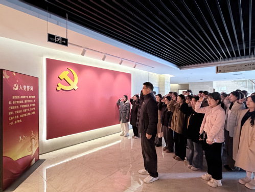 面向鲜艳的中国共产党党旗,全体党员庄严举起右拳,重温入党誓词。铿锵有力的宣誓声回荡在馆内,表达了学生党员对党的忠诚与为共产主义事业奋斗终身的坚定信念。不仅强化了身份认同,也更加明确了党员的责任与担当。