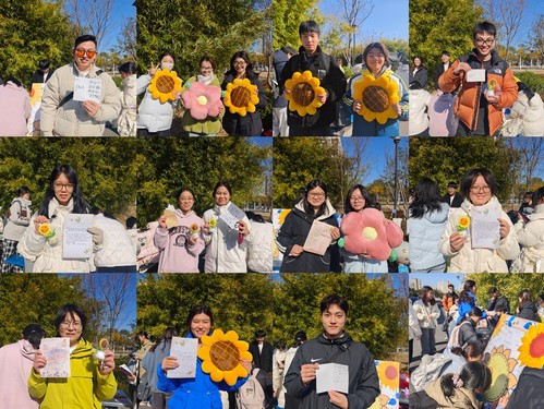线下活动于西苑食堂门口开展,长桌上整齐摆放着信笺、信封、向日葵抱枕、摆件等,现场布置温馨有序。同学们在冬日阳光下执笔书写,将对父母、师长、朋友的感谢与祝福落于纸上。许多同学表示,平日忙碌于学业,很少有机会静心书写情感,这样的活动不仅提供了表达的载体,也唤起了内心深处对身边人的感念。同时,“太阳花感恩留言”互动区也吸引了众多同学参与,大家通过手绘、短句传递心声,让创意与感恩在指尖交汇流动。