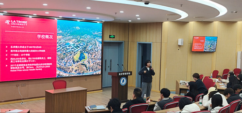12月10日与14日,学院分别面向工商管理(中澳合作办学)2025级、2024级本科生及家长,举办了两场赴澳留学信息分享会暨签约会。活动旨在帮助学生与家长深入了解澳大利亚乐卓博大学及中外合作办学项目的具体情况,明确留学路径与学业规划。乐卓博大学(La Trobe University)校方代表刘颖(Sid)女士,上海育璀教育海外留学咨询部经理鲍彦廷、张娴女士,项目留学代表李中阳同学,项目2024级部分学生家长,经济管理学院工商管理系主任李剑敏出席了活动。宣讲会由中澳合作办学项目经理周潇主持。