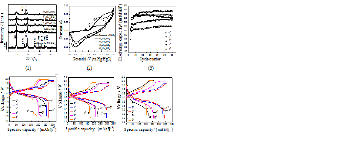 X射线衍射测试表明,样品主要是β-Ni(OH)2,有少量Mn3O4杂相;循环伏安测试表明,x=0.2的材料还原峰积分面积最大、还原分支的峰电流最高;恒流充放电测试表明,在100 mA/g电流密度下,Ni0.8Mn0.2(OH)2放电比容量最高,其第20次循环放电比容量为271.8 mAh/g,同等条件测试的商用β-Ni(OH)2放电比容量为253.6 mAh/g;在300、500 mA/g电流密度下,Ni0.8Mn0.2(OH)2放电比容量仍保持最高,分别为294.7、291.5 mAh/g,而且Mn掺杂Ni(OH)2的循环稳定性也优于商用β-Ni(OH)2。