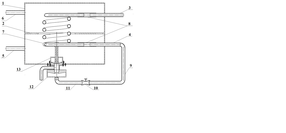 【摘要】本发明提供一种自激脉动强化换热的容积式换热器及其工作方法,所述换热器包括壳体、隔板、热媒入口管段、热媒出口管段、冷媒入口管段、冷媒出口管段、换热管、软管、限流阀、自激振荡装置和脉动液力传动装置。本发明提供的自激脉动强化换热的容积式换热器,热媒介质经过自激振荡装置的亥姆霍兹共振腔产生脉冲射流,利用脉动液力传动装置将脉冲射流有效转化为换热管的有益振动,相比稳态流动工况,将换热效率提高30%。提高了换热效率,减少了换热管传热面积和材料消耗,结构紧凑,安装方便,可应用于船舶余热回收、电站输油、化工加热等。