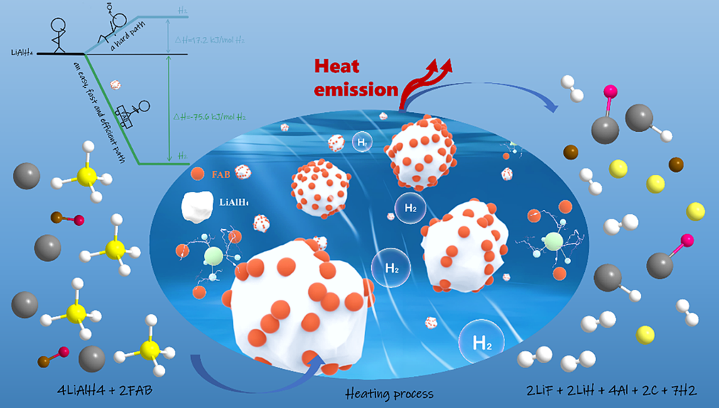 固态储氢技术由于其安全性和经济性被认为是一种良好的储运氢策略,其中,氢化铝锂(LiAlH4)作为一种高容量的且相对便宜的储氢材料,受到了广泛关注。在这项研究中,使用固态氟化乙炔黑来反应失稳LiAlH4。结果发现,复合材料能够在60℃释放超过6 wt%的氢气,然而纯LiAlH4在该条件下不产生任何的氢气,说明该失稳方法有效的促进了LiAlH4低温高效制氢。进一步通过材料表征手段,发现氟化乙炔黑颗粒广泛且均匀的分布在LiAlH4颗粒表面,能够提供大量的氢气传输路径,并且有效的释放出反应中产生的热量。最后,通过Kissinger方程,计算出了复合材料放氢反应焓变,其远低于纯LiAlH4放氢焓变,说明掺杂氟化乙炔黑能够有效的改善LiAlH4放氢热力学性能。该工作为LiAlH4温和条件下的简单制氢工艺提供启发。