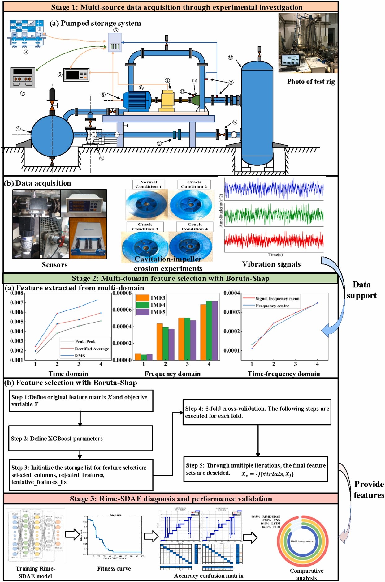 本研究解决了深海离心泵中多条件空蚀和叶轮侵蚀损伤的关键工程挑战,传统方法在这些领域存在特征冗余和泛化能力不足的问题。通过将Boruta-Sap可解释特征选择与Rime优化的堆叠去噪自动编码器(SDAE)集成,提出了一个由人工智能(AI)驱动的框架。首先,振动信号经历多域特征提取。Boruta-Shap 方法通过沙普利值和阴影特征假设检验来量化特征相互作用,从而实现基于物理的空蚀能量指示器和叶轮损伤瞬态特征的选择,从而降低约70%的特征维度。其次,受冰晶生长动力学启发的Rime算法,通过平衡软霜探索和硬霜开采,全球优化SDAE超参数。在可变条件下(0.8、1.0和1.2Q)下进行了实验验证d该框架实现了96%的测试准确率,优于其他诊断模型,且减少了交叉病症错误分类。通过将可解释的人工智能与多物理诊断相结合,这项工作为能源基础设施的预测性维护提供了可复制的解决方案,推动了面对复杂水动力扰动的工业系统智能维护技术的发展。