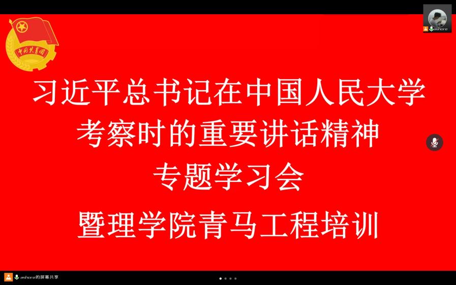 在五四青年节即将到来之际,习近平总书记4月25日上午来到中国人民大学考察调研。为深入学习习近平总书记在中国人民大学考察时的重要讲话精神,理学院于4月30日线上开展了“习近平总书记在中国人民大学考察时的重要讲话精神”专题学习会暨理学院青马工程培训。理学院团委书记李屏,理学院学生干部与青年团员与会,理学院团委副书记张永幸主持会议。