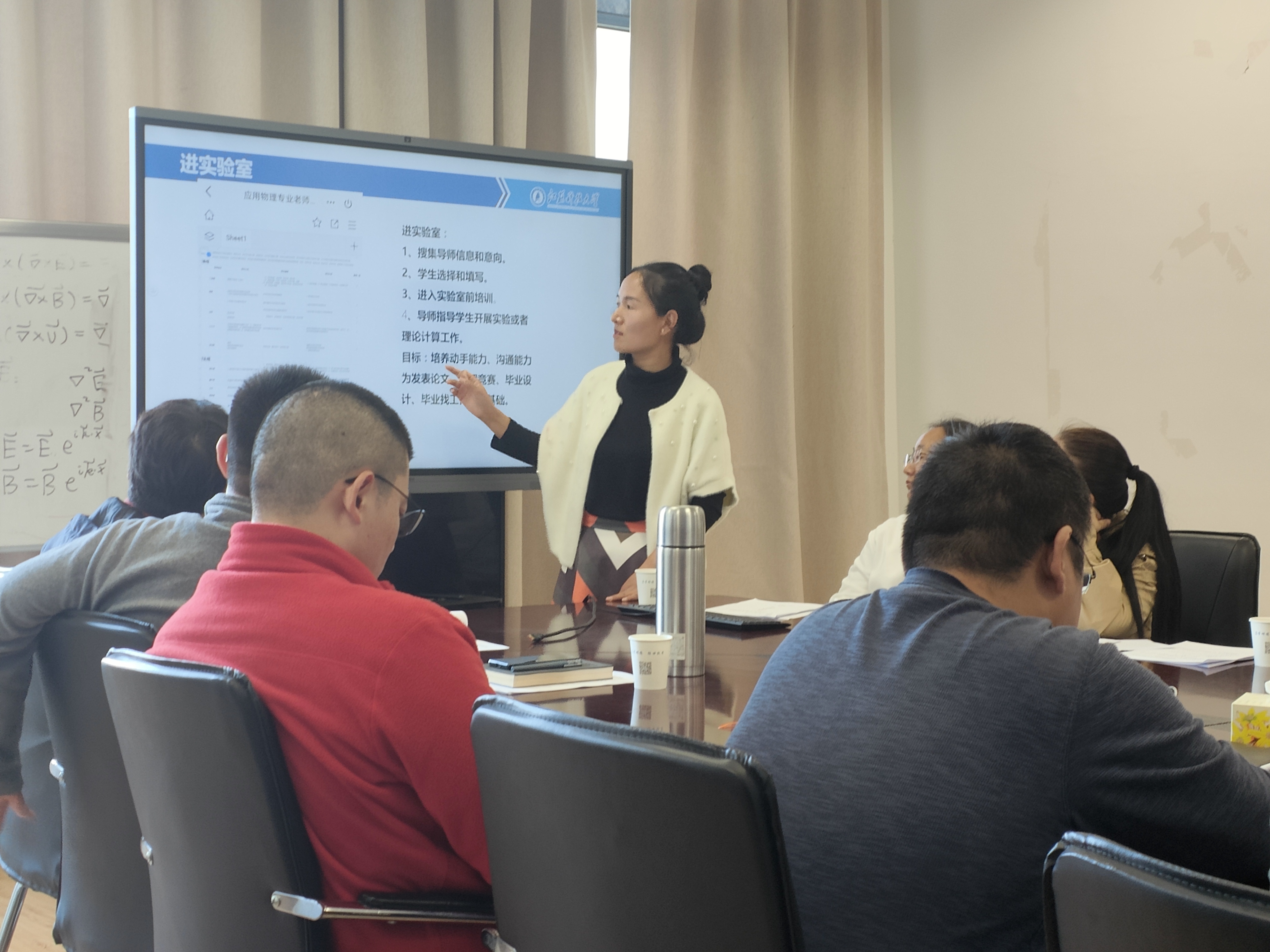 在班主任经验分享环节,2021级应用物理学专业班主任徐加焕老师通过ppt分享了带班经验:一是开展学生进实验室活动,培养学生的动手能力和沟通能力,为论文发表、学科竞赛、毕业设计、就业创业打下基础;二是实施朋辈帮扶行动,发挥学长导师的传帮带作用,团结带领后进学生在学业上取得进步;三是主动适应学生成长规律,通过信息化手段做好班级管理;四是每周做好宿舍卫生情况通报,督促学生及时整改宿舍卫生问题。
