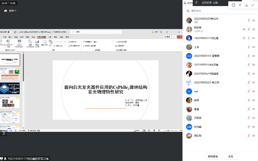 会上,两组项目负责人蔡雯雯同学和刘钰鑫同学分别围绕项目主题,通过ppt展示的形式详细地介绍了项目研究方向的重点、创新点以及取得的阶段性成果。两位老师就每个项目的参赛类别、最新研究成果及项目侧重点等方面进行耐心细致的询问并提出宝贵的意见和建议。