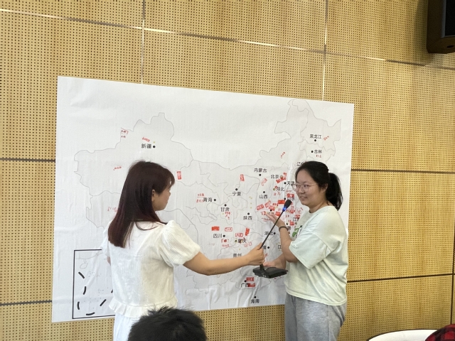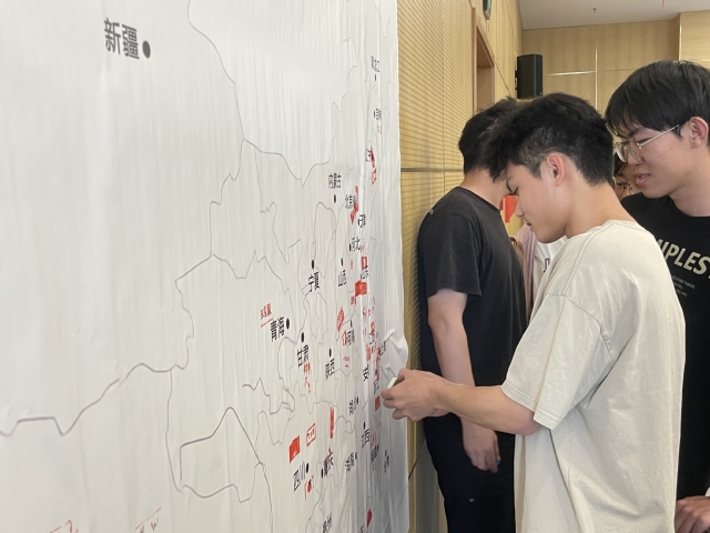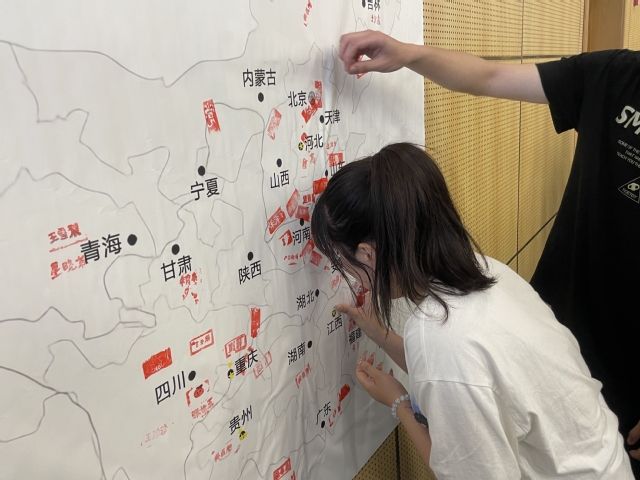 紧接着,每位同学将自己制作的姓名印章蘸上红彤彤的印泥,印到自己所属省份的中国地图墙上。大家接力篆印,地图上的姓名渐渐从无到有,积微成著,正如中国工农红军创建革命根据地时的铢积寸累,新时代青春学子的力量接续红色革命血脉,最终星星之火,成为了燎原之势。