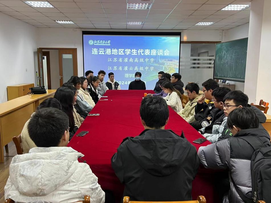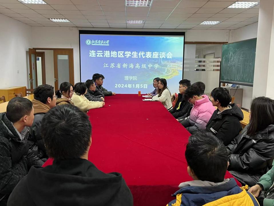 1月5日下午,理学院在梦溪校区303会议室召开连云港地区学生代表座谈会,学院辅导员刘培培和来自江苏省新海高级中学、江苏省灌南高级中学、江苏省灌云高级中学三所生源地中学的近40名学生代表参加座谈会。会议由院党委副书记周志辉主持。