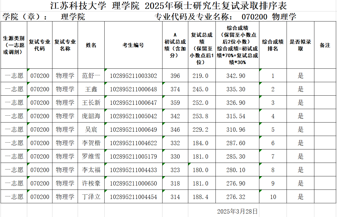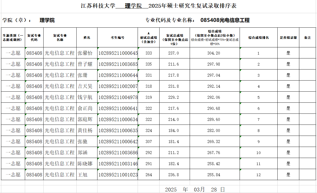 根据理学院研究生复试细则(已发布公告),2025年理学院物理学学硕、光电信息工程专硕第一志愿复试成绩公示如下: