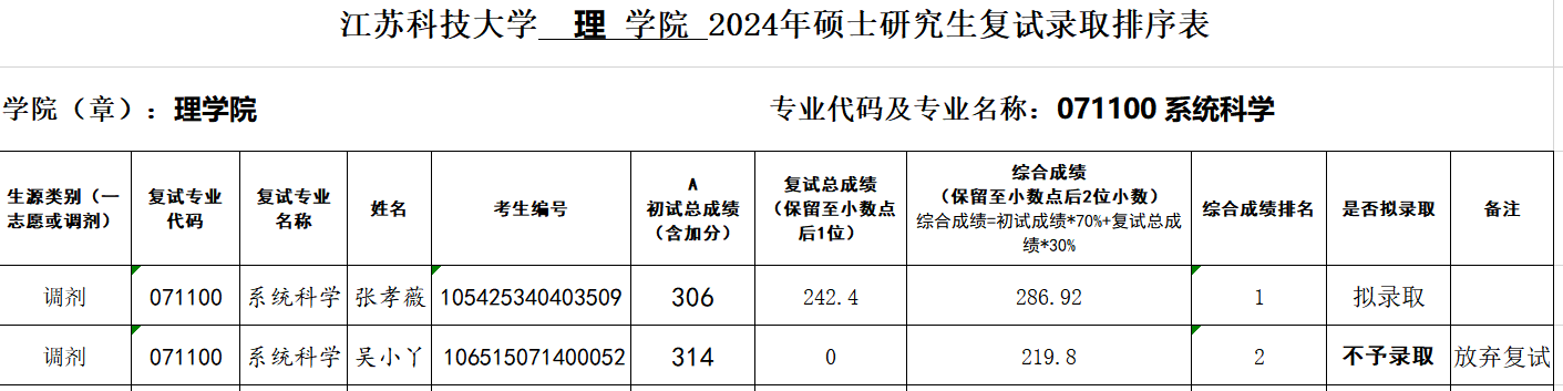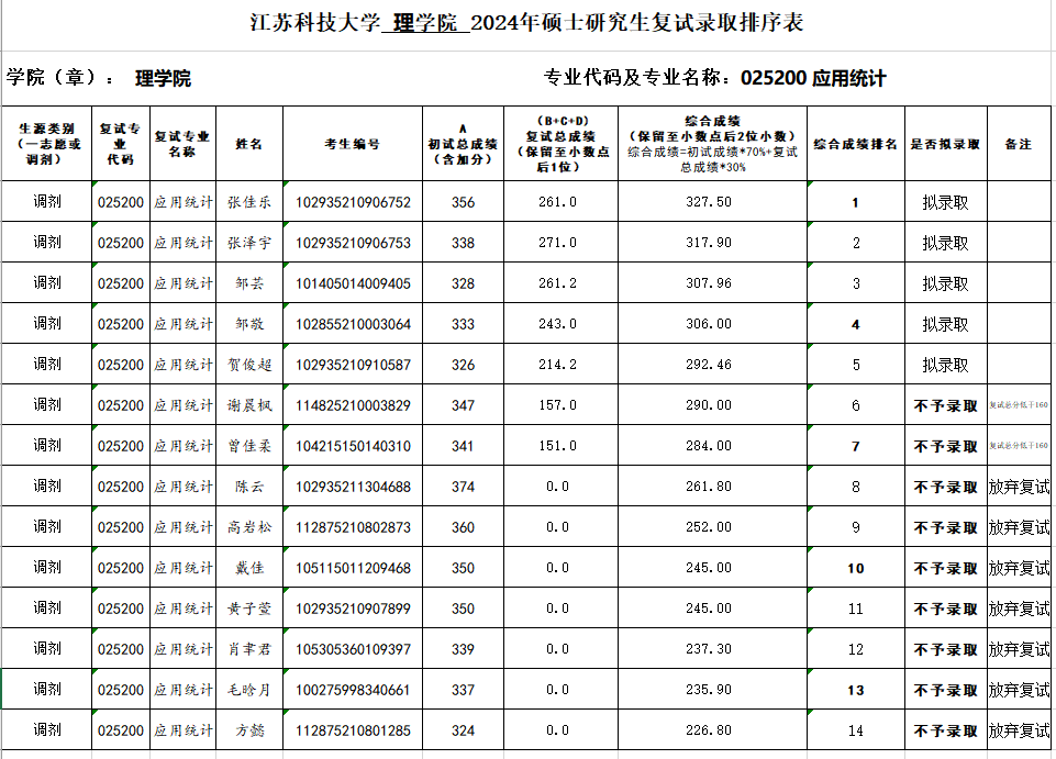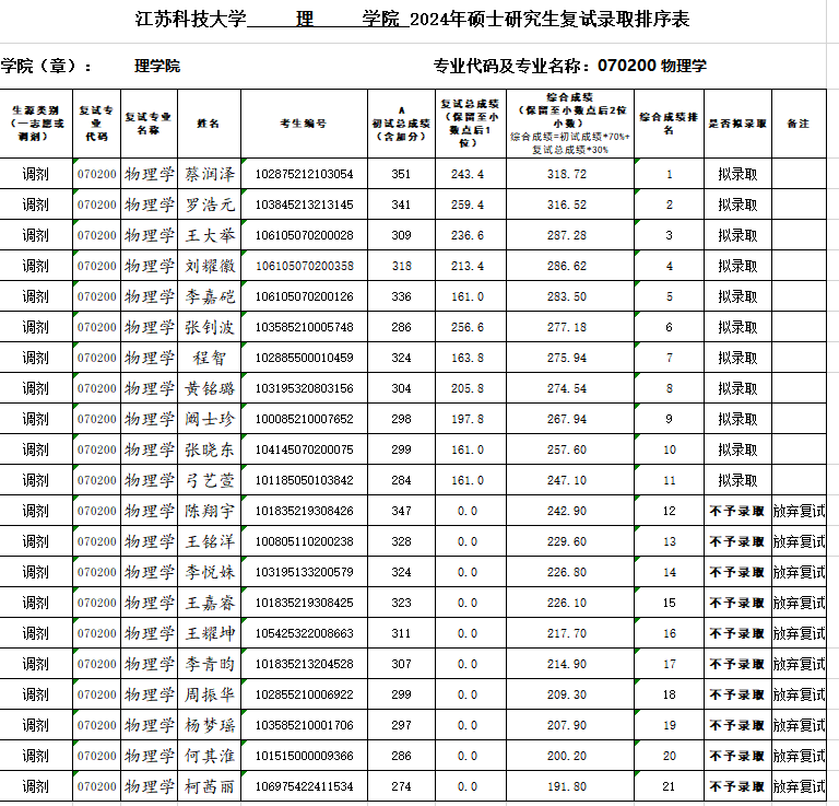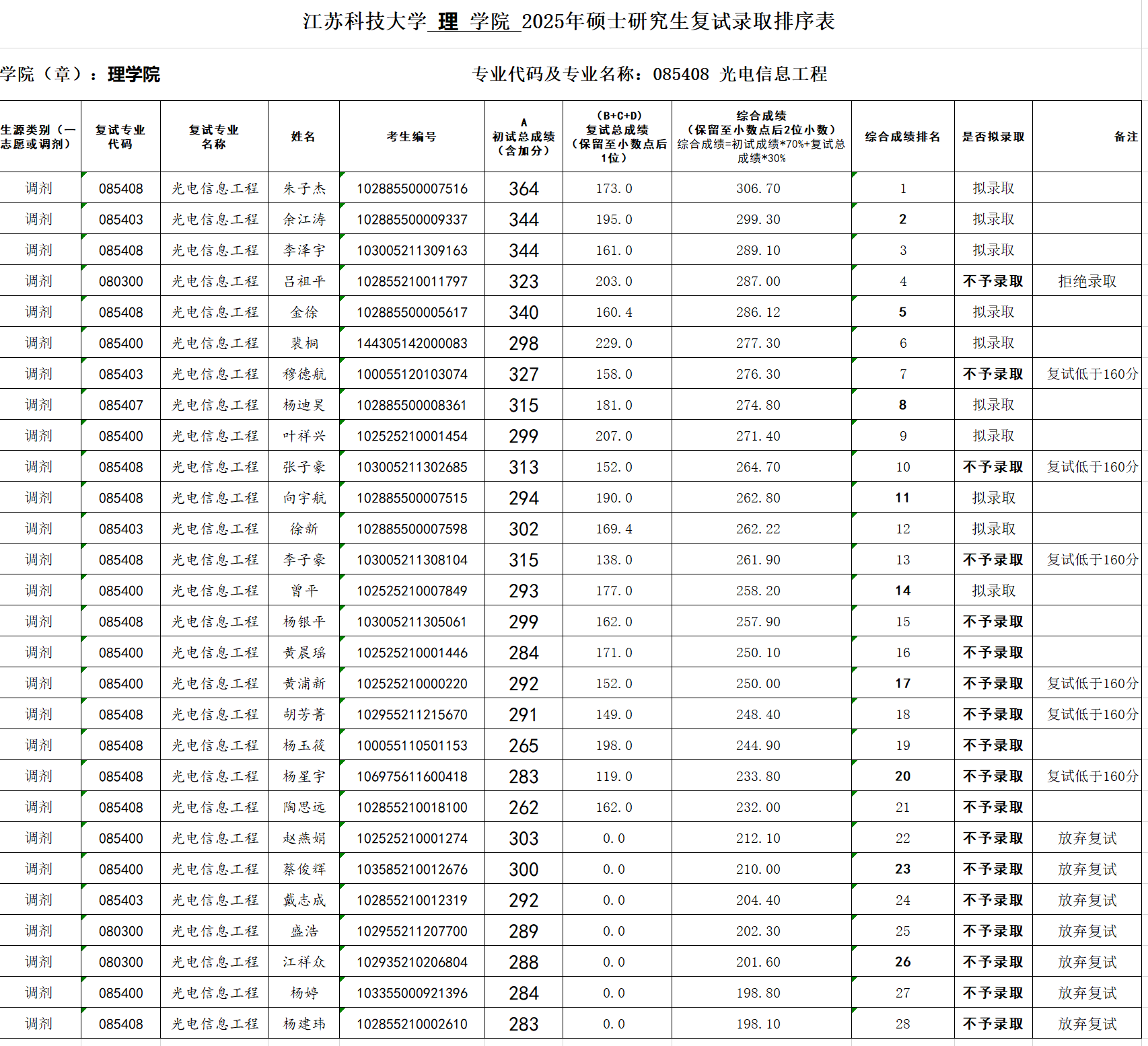 根据理学院研究生复试细则(已发布公告),2025年理学院物理学学硕、系统科学学硕、光电信息工程专硕和应用统计专硕第一批调剂复试成绩公示如下: