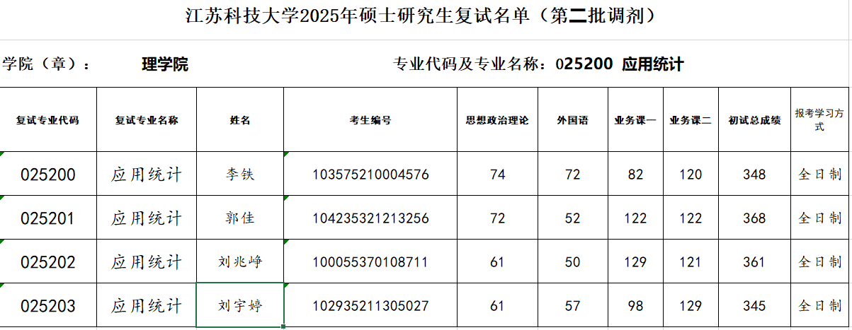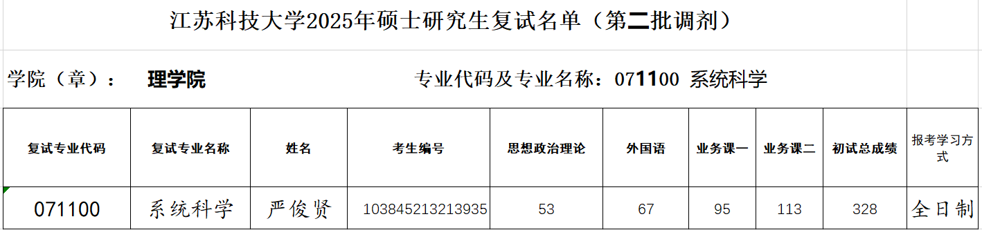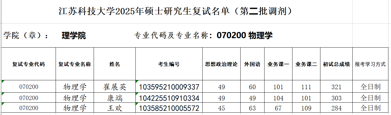 根据理学院研究生复试细则(已发布公告),2025年理学院物理学学硕、系统科学学硕、应用统计专硕第二批调剂复试名单公示如下:
